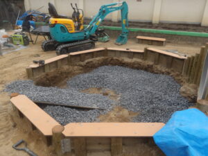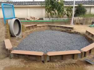 砂場枠の設置も完了して、ガラを取り除き、砂を入れるための準備として