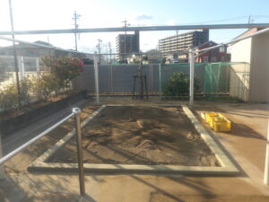 コンパネを敷いて養生し、加熱殺菌を行っています。