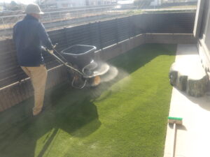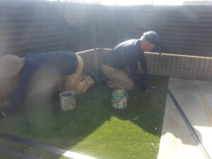 ボンドを塗り広げ、人工芝を設置していきます。
