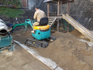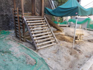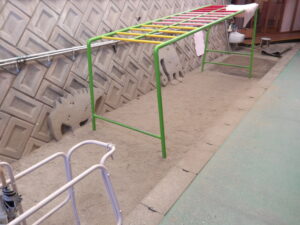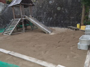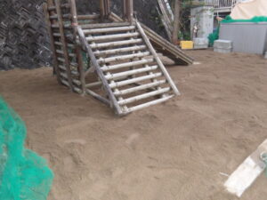 加熱殺菌した砂は、遊具の奥側から入れていき、最終的に手前を入れる形になります。