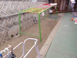 遊具の奥や中は、重機が届かない状態なので外に出し、重機で引っ張っています。