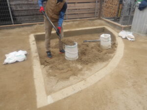 加熱殺菌砂はトラックに載せており、重機から受け取り砂場に運び入れております。