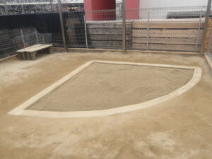 裏手の門があるところに、グランドと砂場があり機械、重機は入れる事が出来ないので
