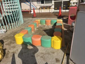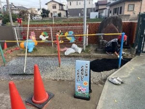 ゴムチップ舗装にともなって砂場が移動となりました。